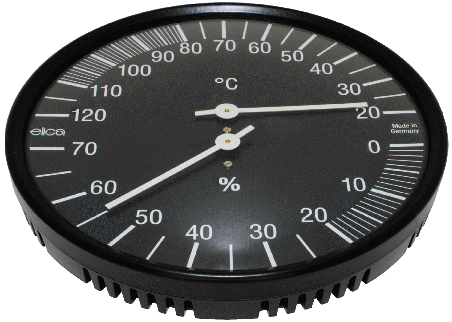 Präzisionsinstrument (Hygrometerwerk mit Faden, Thermometerwerk Bimetall) mit nachstellbarem Messwerk, Gehäuse aus schwarzen Kunststoff, Skala schwarz - Saunamessbereiche sind mit weißen Zwischenstrichen markiert, Tiefe ca. 32 mm