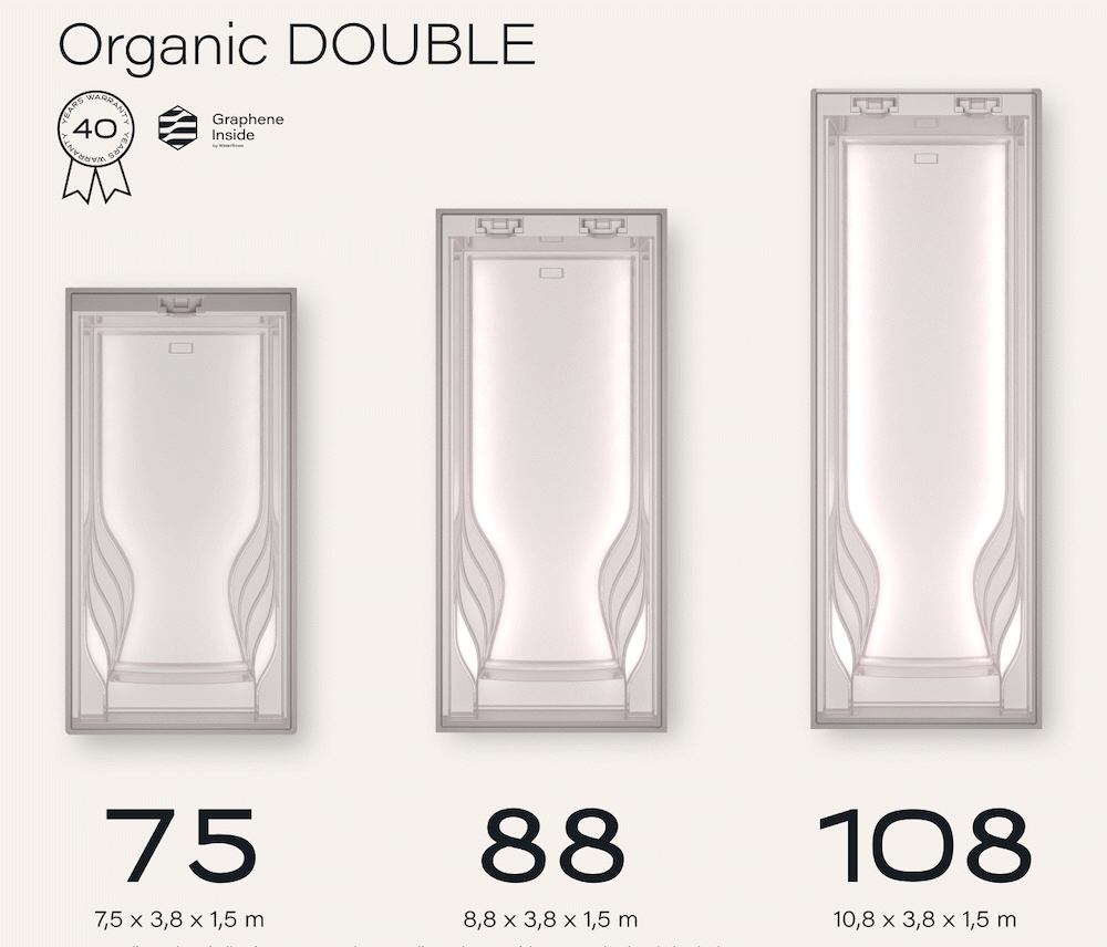 Stufen auf beiden Seiten und eine zentrale bank schaffen ein symmetrisches Design für gesellige Stunden und gemeinsames Entspannen. Der ORGANIC Double ist ideal für großzügige Terrassen und Familienmomente.